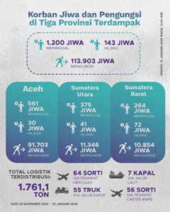 Distribusi bantuan logistik sejak 29 November 2025 hingga 20 Januari 2026 telah mencapai 1.761,1 ton, disalurkan melalui jalur udara, darat, dan laut. Pada 20 Januari 2026, total logistik yang disalurkan mencapai 50,59 ton di wilayah Aceh, Sumatra Utara, dan Sumatra Barat.